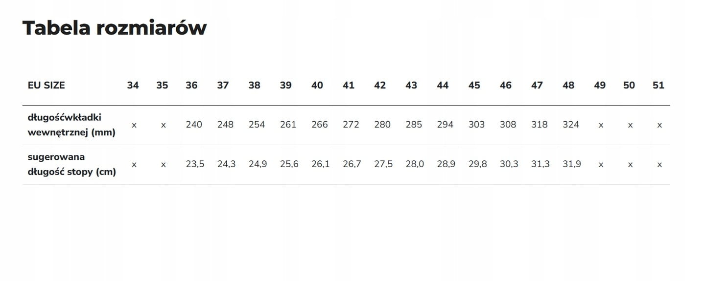 | Rozmiar obuwia | Długość wkładki (cm) |