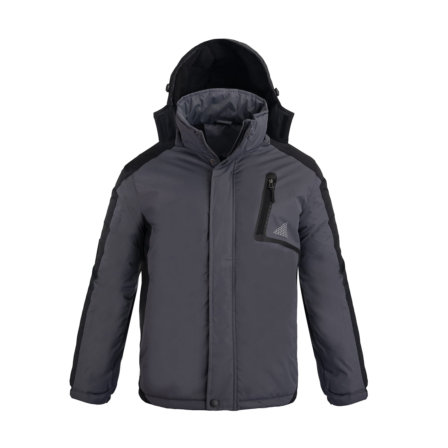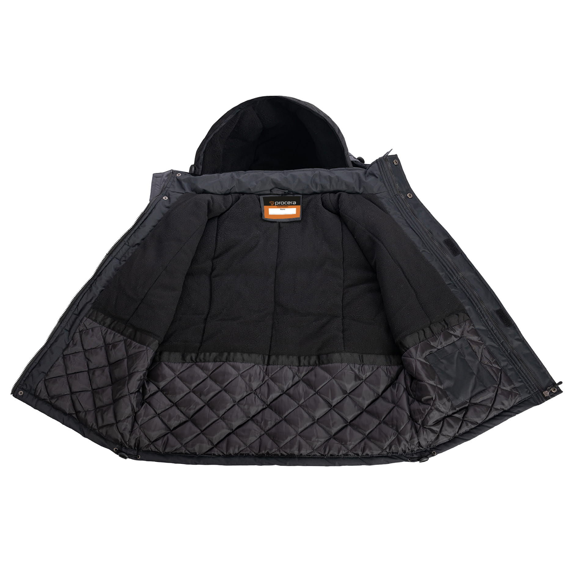 Odpinany kaptur z polarowym ociepleniem posiada regulację za pomocą troczków i dodatkowe zapięcie na rzep, zapewniając maksymalną ochronę głowy przed przenikliwym zimnem i niekorzystnymi warunkami atmosferycznymi.