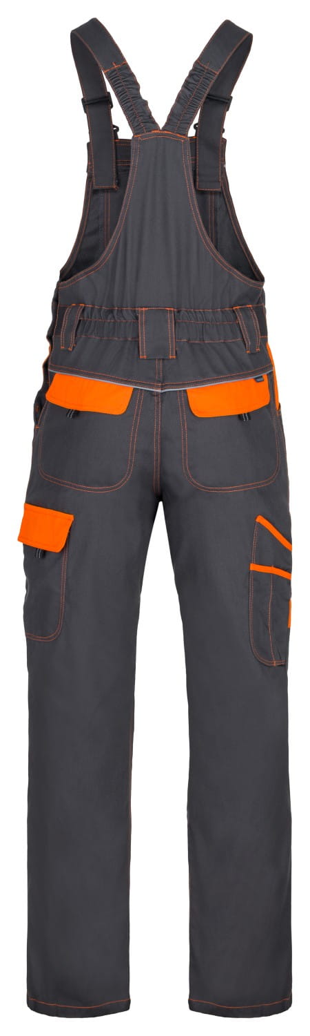 Nikt nie lubi, gdy ubranie robocze ogranicza ruchy. Dlatego ten model został wyposażony w elastyczną gumę w pasie, praktyczne zapięcie na guziki z lewej strony oraz wytrzymałe, pracujące razem z ciałem szelki. Dzięki takiemu zestawieniu spodnie perfekcyjnie dopasowują się do sylwetki. W newralgicznych miejscach, takich jak kolana, zastosowano solidne wzmocnienia, które znacząco wydłużają żywotność materiału podczas pracy w pozycji klęczącej.