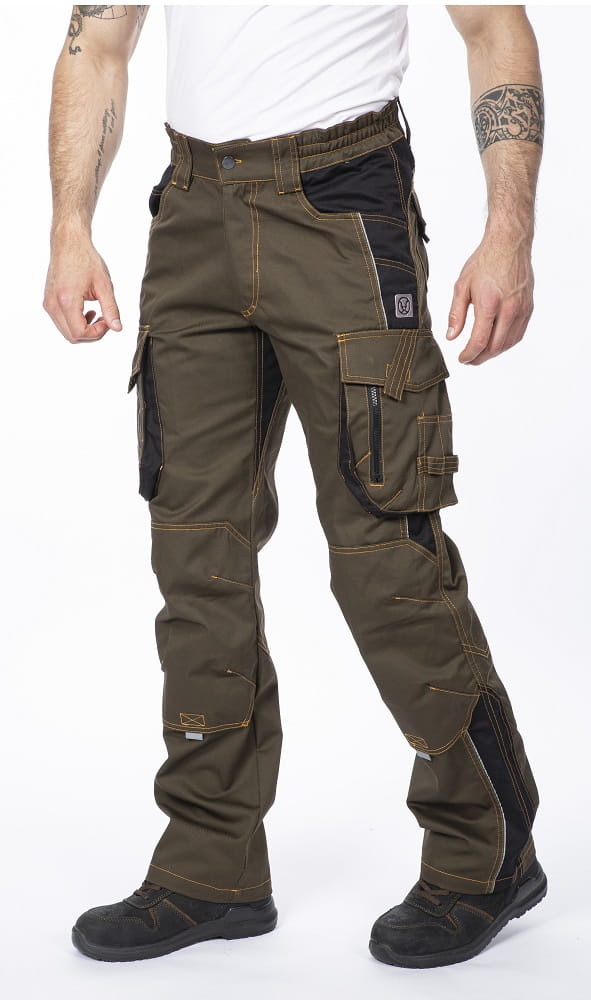 Zastosowany materiał to solidny splot diagonalny, łączący oddychającą bawełnę z wytrzymałym poliestrem. Optymalna gramatura sprawia, że spodnie są odporne na codzienne zużycie, a jednocześnie gwarantują odpowiedni komfort termiczny. Przemyślany, anatomicznie wyprofilowany krój nogawek świetnie współpracuje z ciałem w ruchu. Jeśli często pracujesz na kolanach, docenisz podwójną warstwę materiału w tej strefie oraz dedykowane, zintegrowane kieszenie na nakolanniki. Całość wyróżnia się nowoczesnym, wpadającym w oko designem – kontrastowe pikowanie dżinsową nicią, solidne suwaki oraz stylowe wzmocnienia tworzą świetny efekt wizualny, a odblaskowe detale z przodu i z tyłu dbają o Twoje bezpieczeństwo po zmroku.