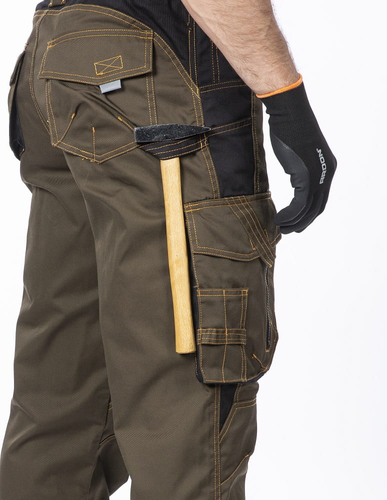- ZAAWANSOWANY SYSTEM KIESZENI - mnóstwo miejsca na podręczne wyposażenie: 2 kieszenie przednie, 2 tylne, pojemne kieszenie miechowe na nogawkach oraz dedykowane uchwyty na ołówki i aż dwie przegrody na składaną miarkę.
