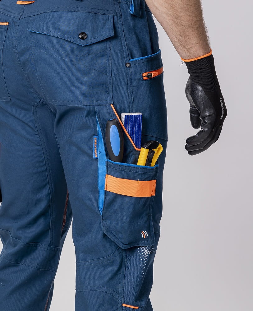 • streczowe bawełniane spodnie robocze ze specjalnego, odznaczającego się zwiększoną wytrzymałością oraz gładką i delikatną powierzchnią materiału Amalytton®