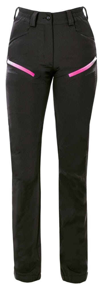 Damskie spodnie softshellowe o dopasowanym kroju SLIM FIT. Rozciągliwy w czterech kierunkach lekki softshell z membraną ElasticTech®Flexi sprawdzi się także w wymagających warunkach, zapewnia doskonałą ochronę przed wiatrem, jest wodoodporny, szybkoschnący i utrzymuje optymalną temperaturę ciała. Na zewnętrznej stronie ud wentylacja – zamki z siateczkową wstawką. Tylna część oddzielona od pasa karczkiem, z przodu 2 kieszenie zapinane na zamek, elastyczny, wyprofi lowany pas zwiększa komfort noszenia. Funkcjonalnie wyprofi lowane nogawki, zwężany krój, dół nogawek z możliwością regulacji obwodu za pomocą zatrzasków, wewnętrzny haczyk z gumką do mocowania nogawek do butów. Wzornictwo uzupełniają odblaskowe nadruki 3D.